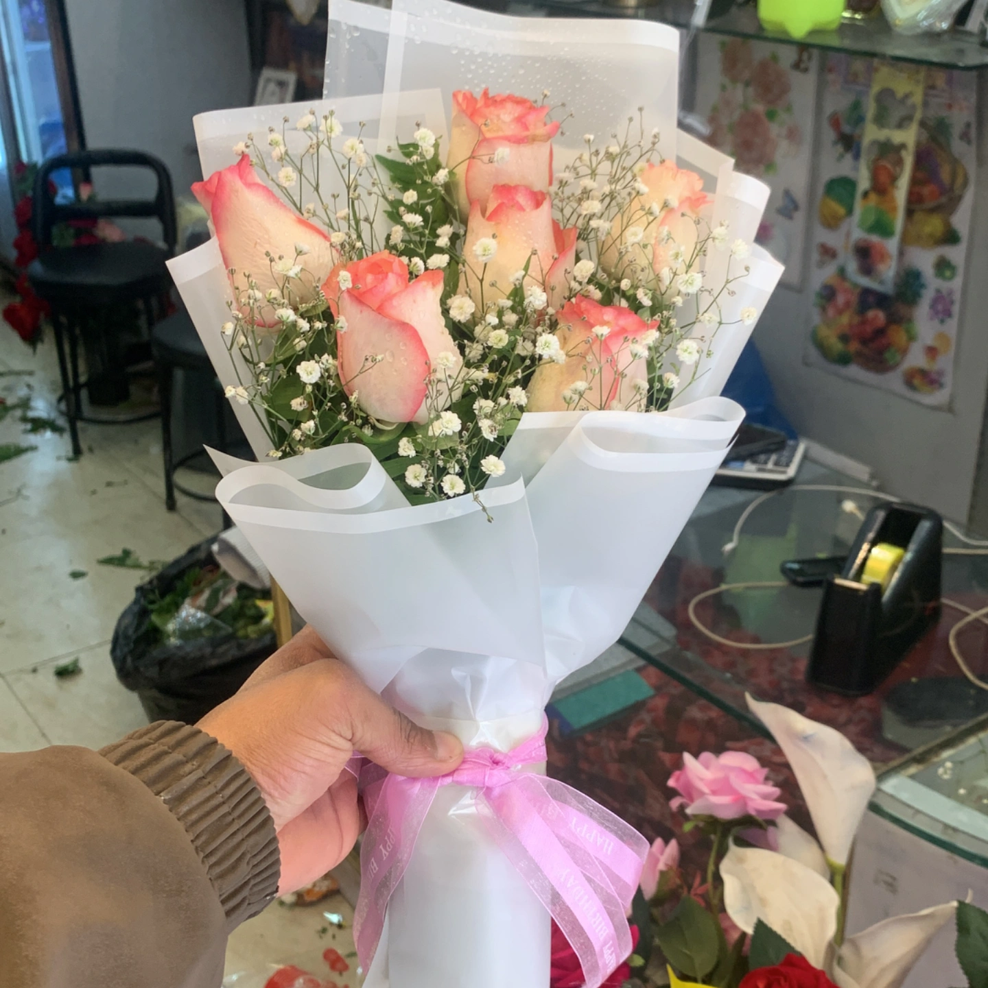 6 pics pink twin headed rose bouquet in white wrapping with baby breathe included