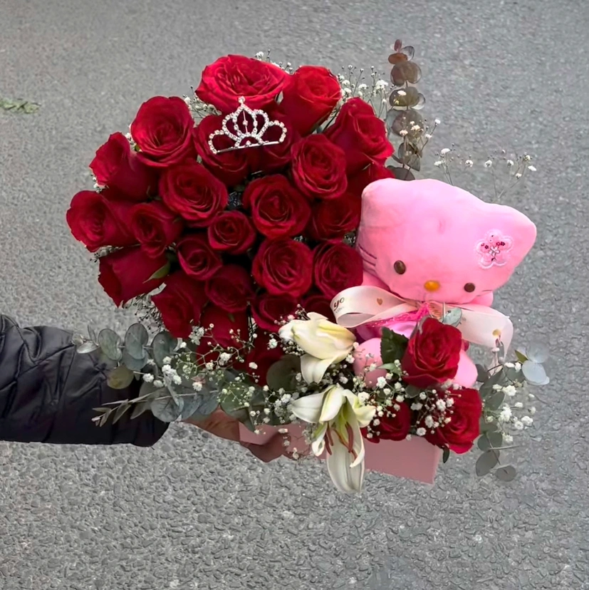 Cute heart shaped box bouquet with hello kitty and lily and crown on it