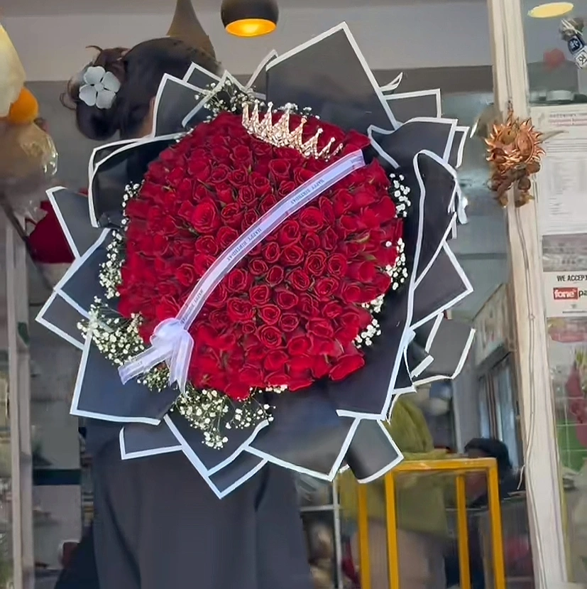 Huge 200 steam rose bouquet with premium crown with baby breathe in black wrapping