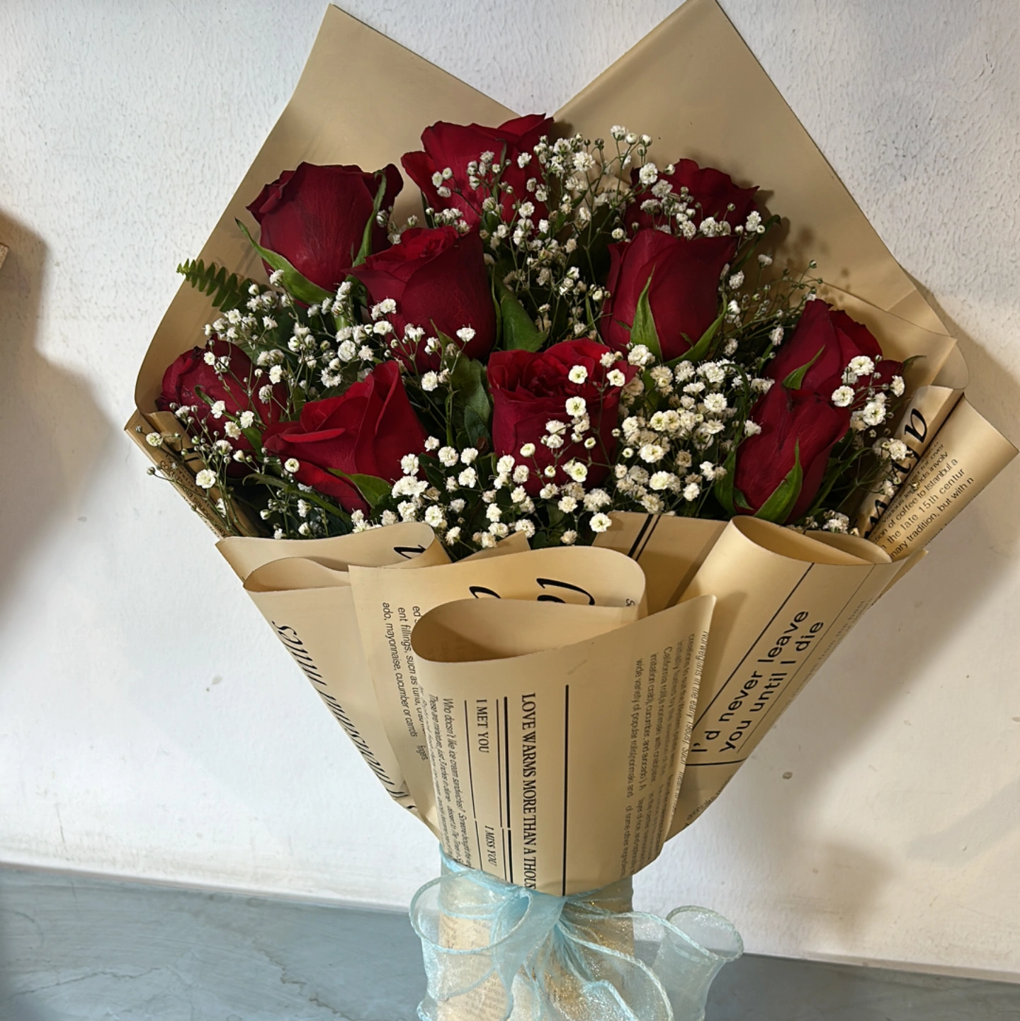 10 pics red roses bouquet bouquet in newspaper wrapping with baby breath