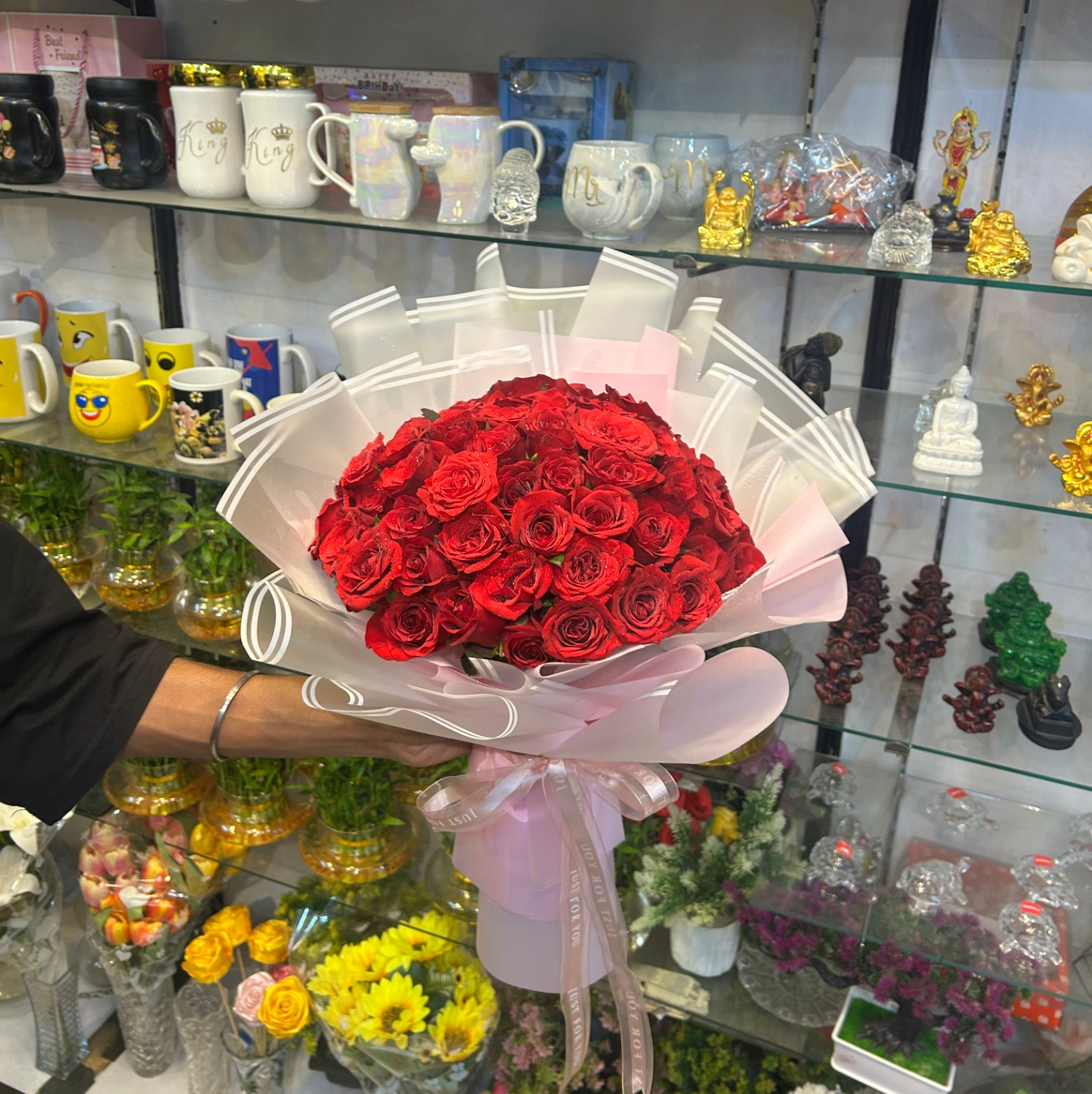 50 pics red roses bouquet in purple wrapping without Jipsi you can costumize tooo