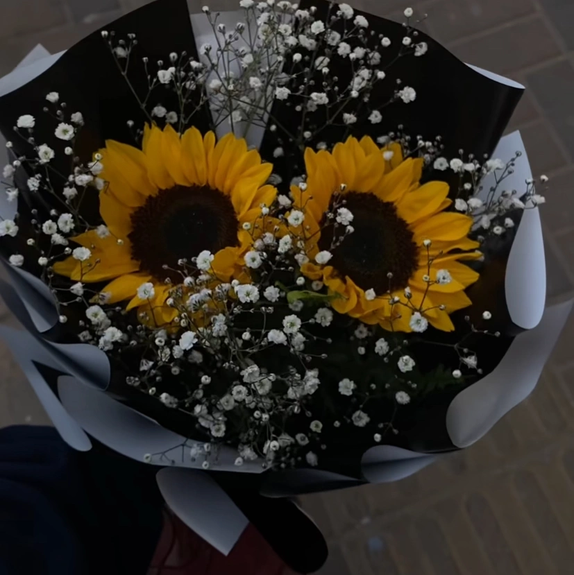 2 sunflower bouquet with baby breathe in black wrapping